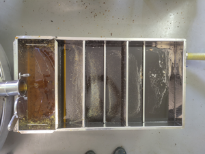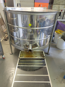 A device that pre-filters honey by slowing down the flow rate and allowing organic and inorganic foreign matter to settle or rise through the placement of multiple baffles at different heights.