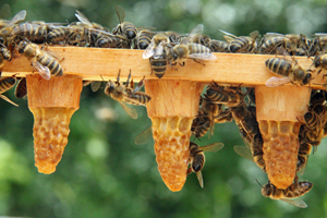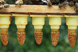 A bar with queen cups attached to it, which is fixed in a breeding frame.
